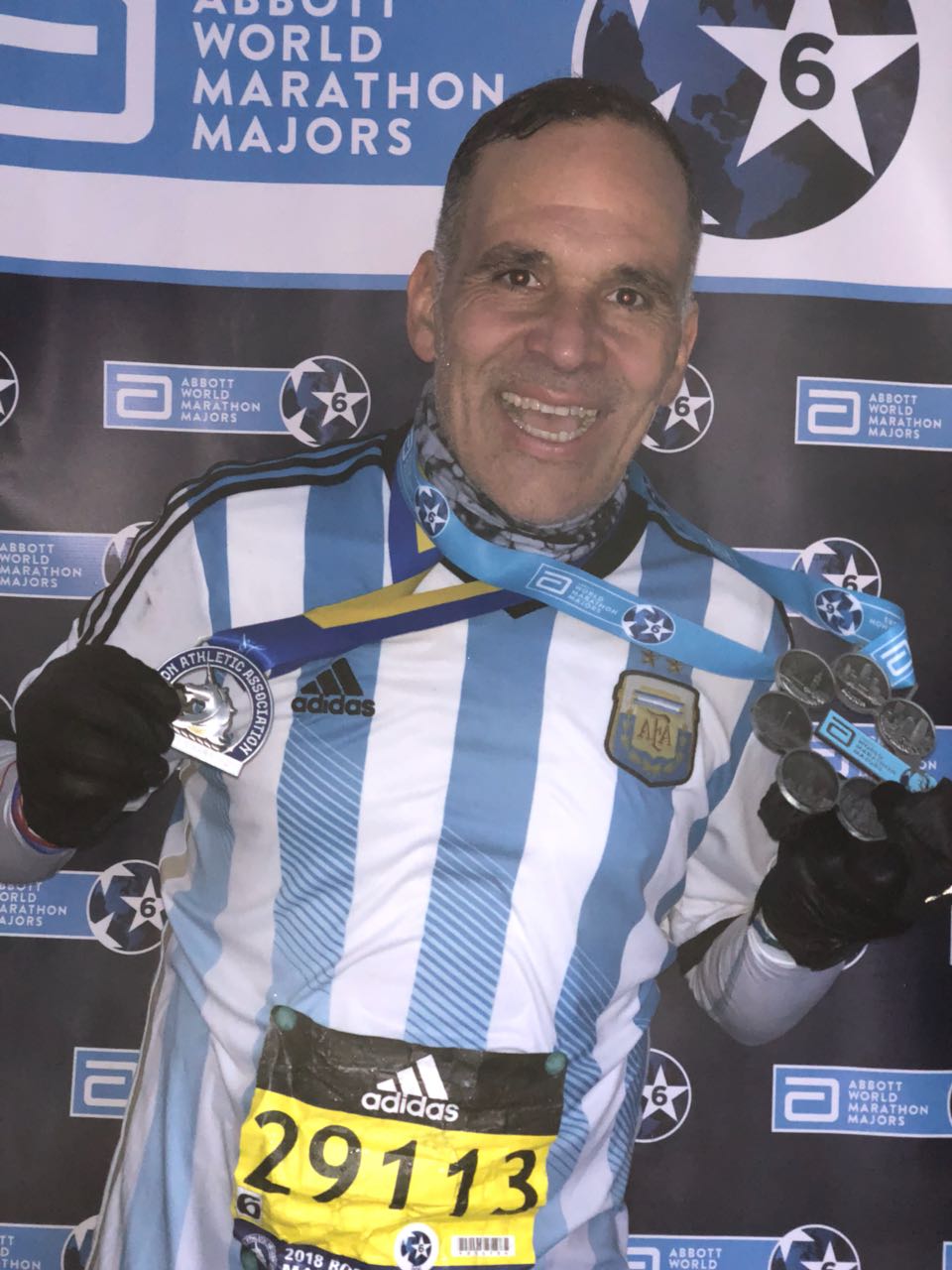 Eduardo Camaño con su medalla de Boston y su 6 Abbott World Marathon Majors Medal
